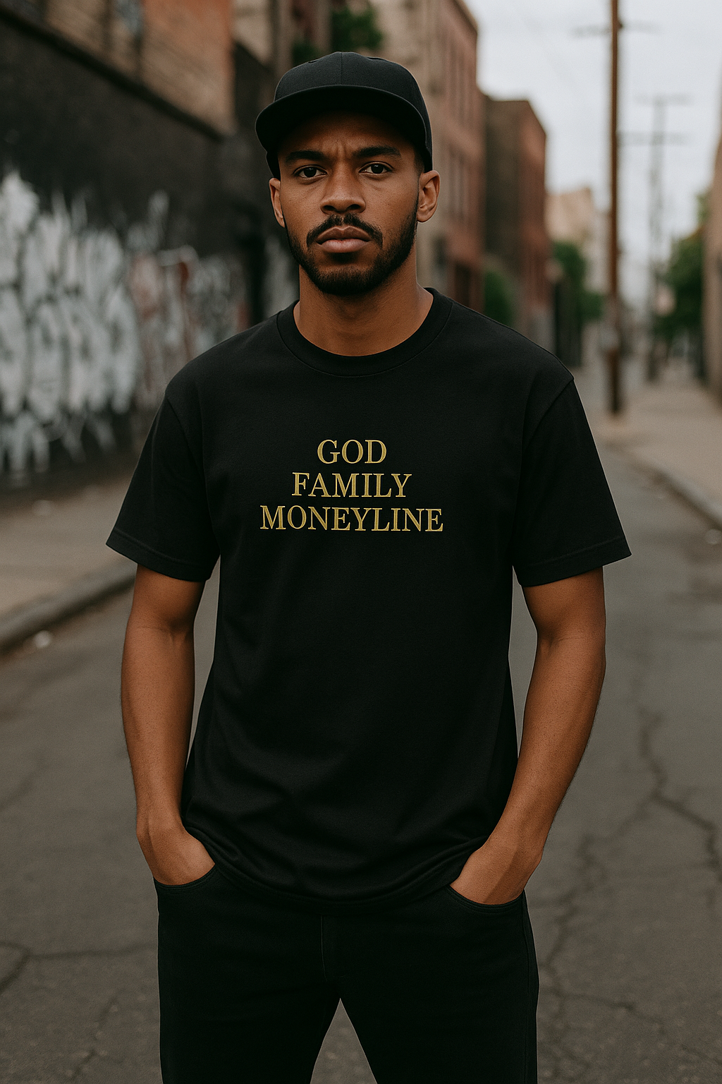 Featuring a bold pyramid graphic with “GOD” at the top, “FAMILY” in the middle, and “MONEYLINE” at the base, the design hits with a flashy streetwear edge and betting-inspired energy. Whether you’re lining up parlays, spending Sunday with family, or living by the code of faith and grit, this shirt brings it all together.